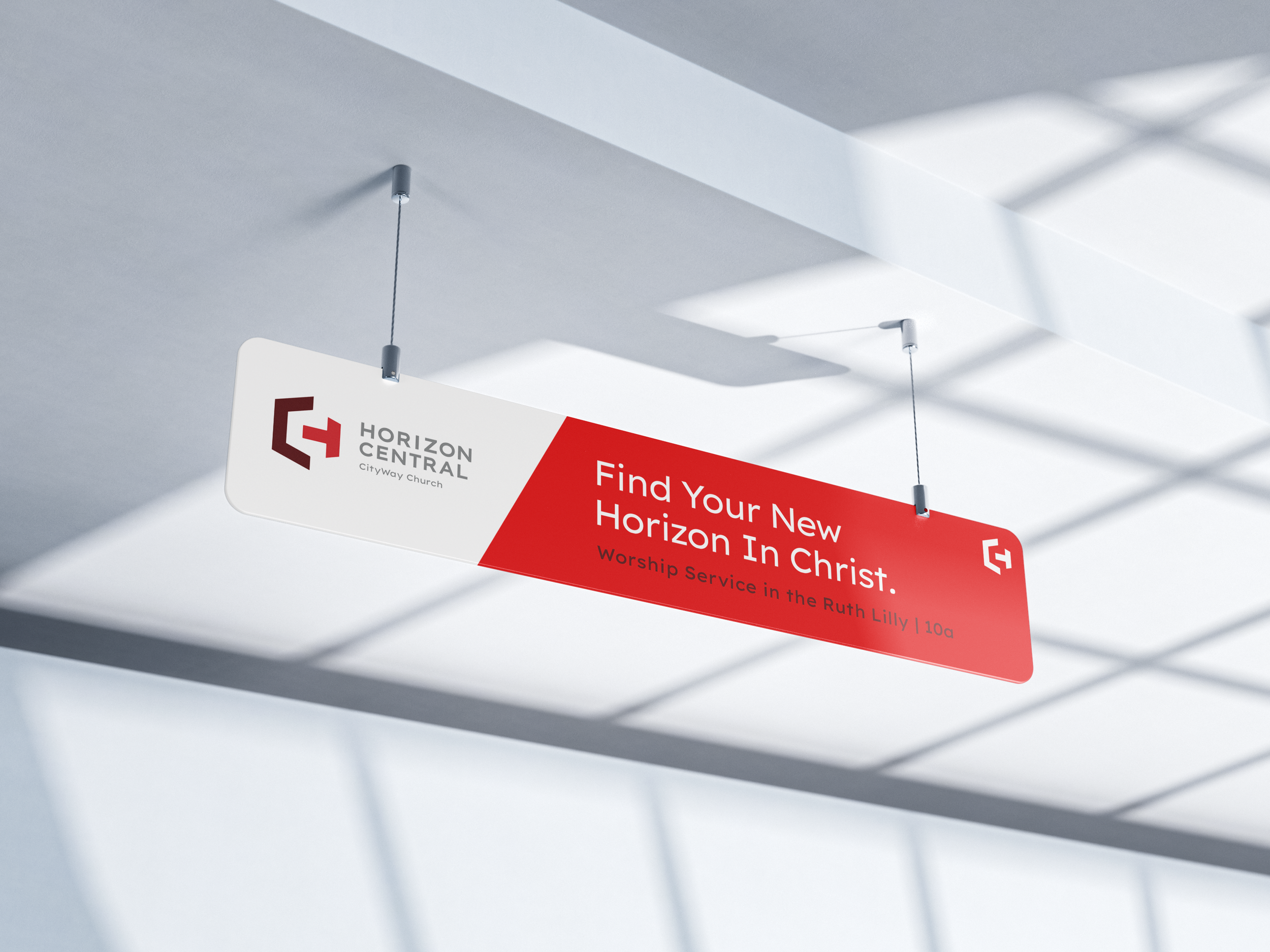 Horizon Central Church serves the downtown Indianapolis community and beyond, offering a modern, welcoming space for all. The brand reflects a forward-thinking vision, symbolizing a look from the present horizon into the future. The identity is designed to be fresh, non-traditional, and distinctive, fitting seamlessly with the vibrant City Way area and its surroundings.